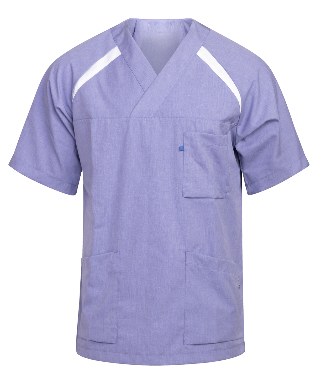 Kittel med v-hals i flott melert metervare med buet kort raglanerme og en brystlomme. Hvit besetning foran og bak på skuldre. To skråstilte sidelommer og splitt i sidene. Nøkkelhempe i høyre lomme. Fargekodet størrelsesmerking på brystlomme.