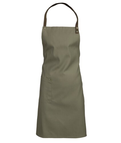 Stilig smekkeforkle med kontrastfarget nakkebånd i brunt stoff. Trykknapp for regulering. Størrelse 90x71 cm.