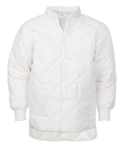 Vattert varmejakke i polyester/bomull med knapper. Ribb nederst på erme. En brystlomme og to sidelommer. Brukes under operasjoner eller til annet helserelatert arbeid i kaldere omgivelser.