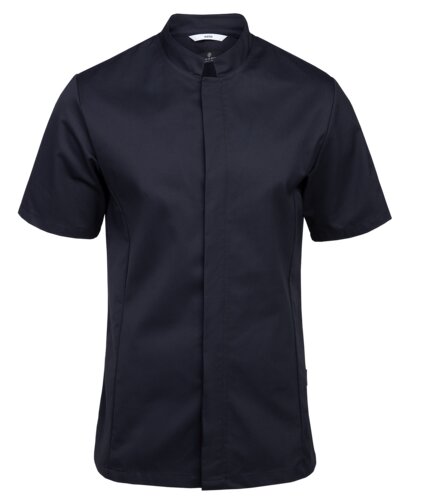Kortermet kokkejakke med skjulte trykknapper. Pennelomme på venstre erme. Splitt i sidene.