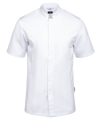 Kortermet kokkejakke med skjulte trykknapper. Unisex modell. Pennelomme på venstre erme. Splitt i sidene.