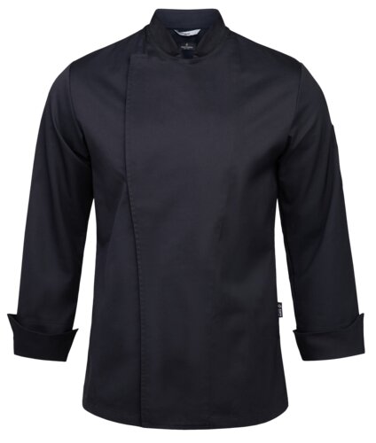 Langermet kokkejakke med dobbeltspent skjulte trykknapper. Sømmet luftehull under begge ermer. Pennelomme på venstre erme. Splitt i sidene.