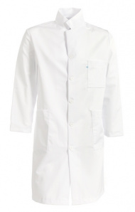 Klassisk legefrakk med plastknapp i front og langt erme. To sidelommer og en brystlomme. Fargekodet størrelsesmerking på brystlomme.