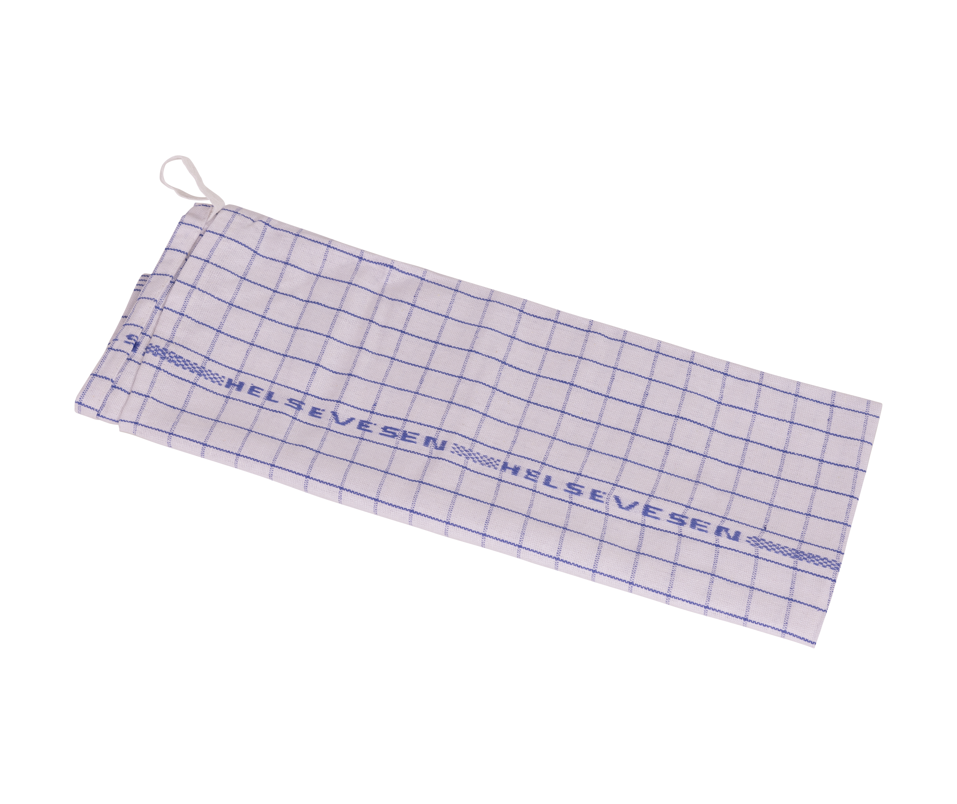 Glatt kjøkkenhåndkle med innvevde blå ruter og HELSEVESEN.