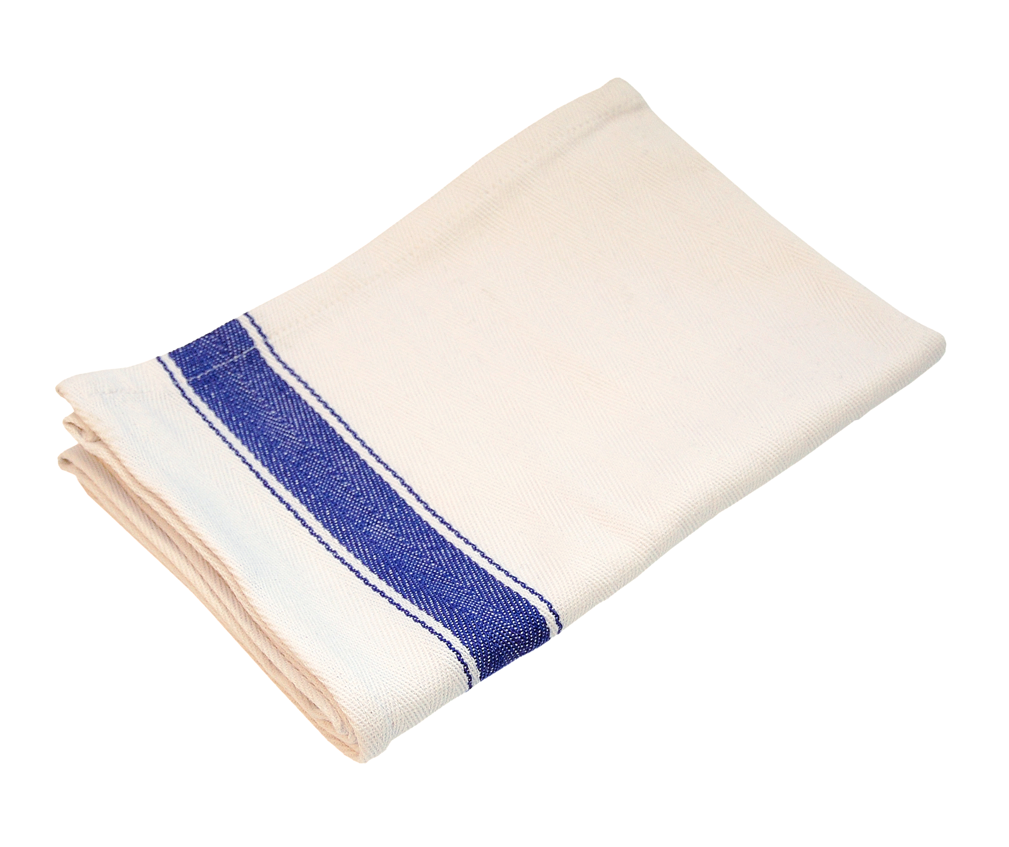 Kjøkkenhåndkle med innvevd garnfarget blå stripe. Herringbone mønster/veving.
