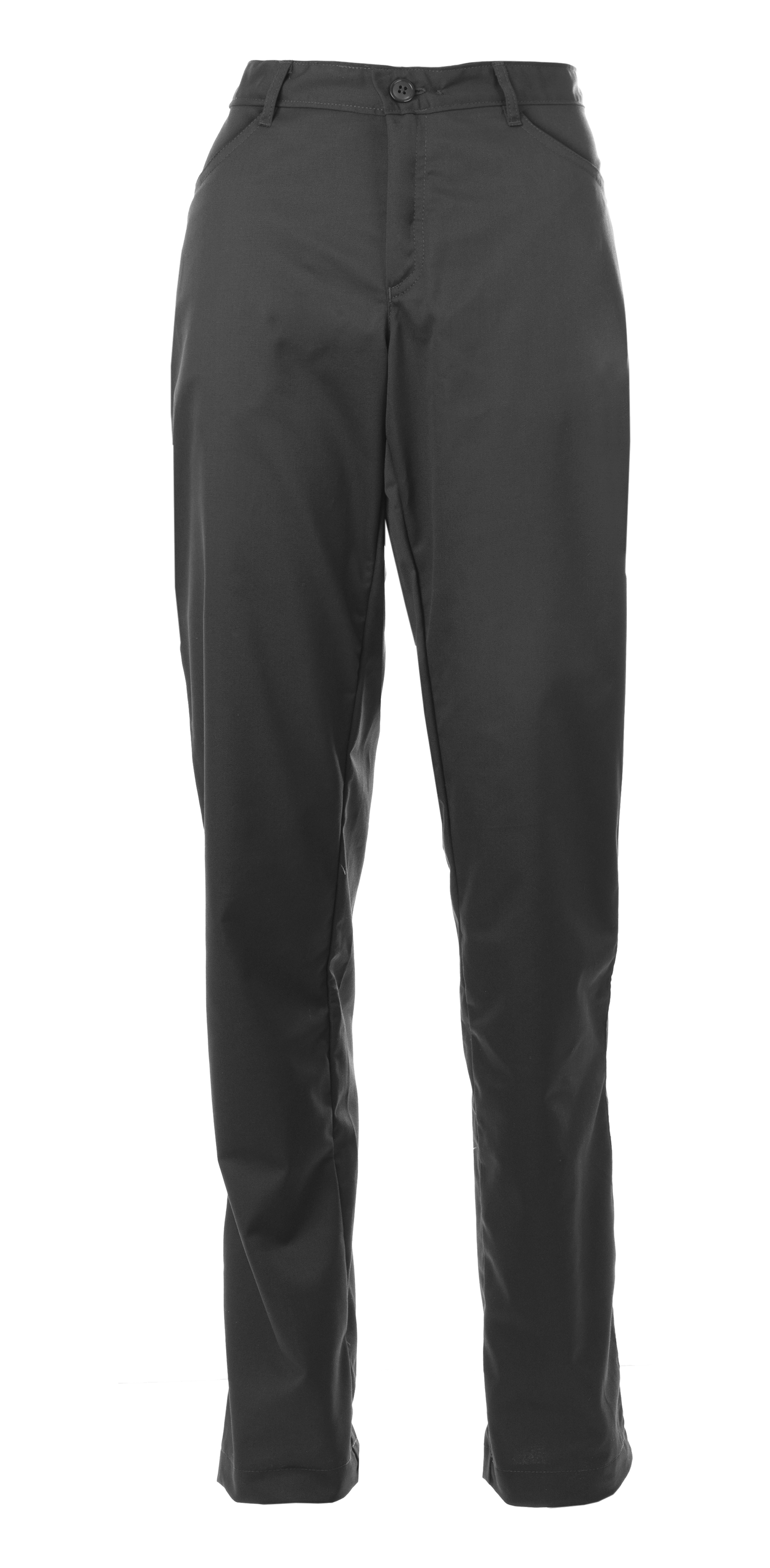Damebukse med lavt liv. Smal passform. Hel linning med beltehemper. Framlommer og to baklommer. To knapper og glidelås i gylf.