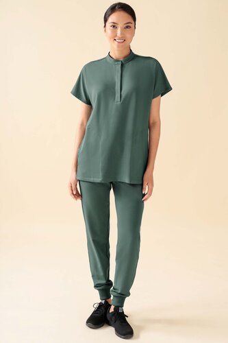 Lekker tunika med ståkrage og vide ermer. Denne sporty, feminine modellen gir et flatterende snitt og maksimal bevegelsesfrihet med vårt eksklusive care-flex-materiale, laget av resirkulert polyester og miljøvennlig viskose fra trær. Stoffet er pustende, hygienisk vaskbart på 60 grader, krøllfritt og klart rett fra vask – perfekt for deg på farten. Med praktiske lommer holder du enkelt alt du trenger trygt på plass