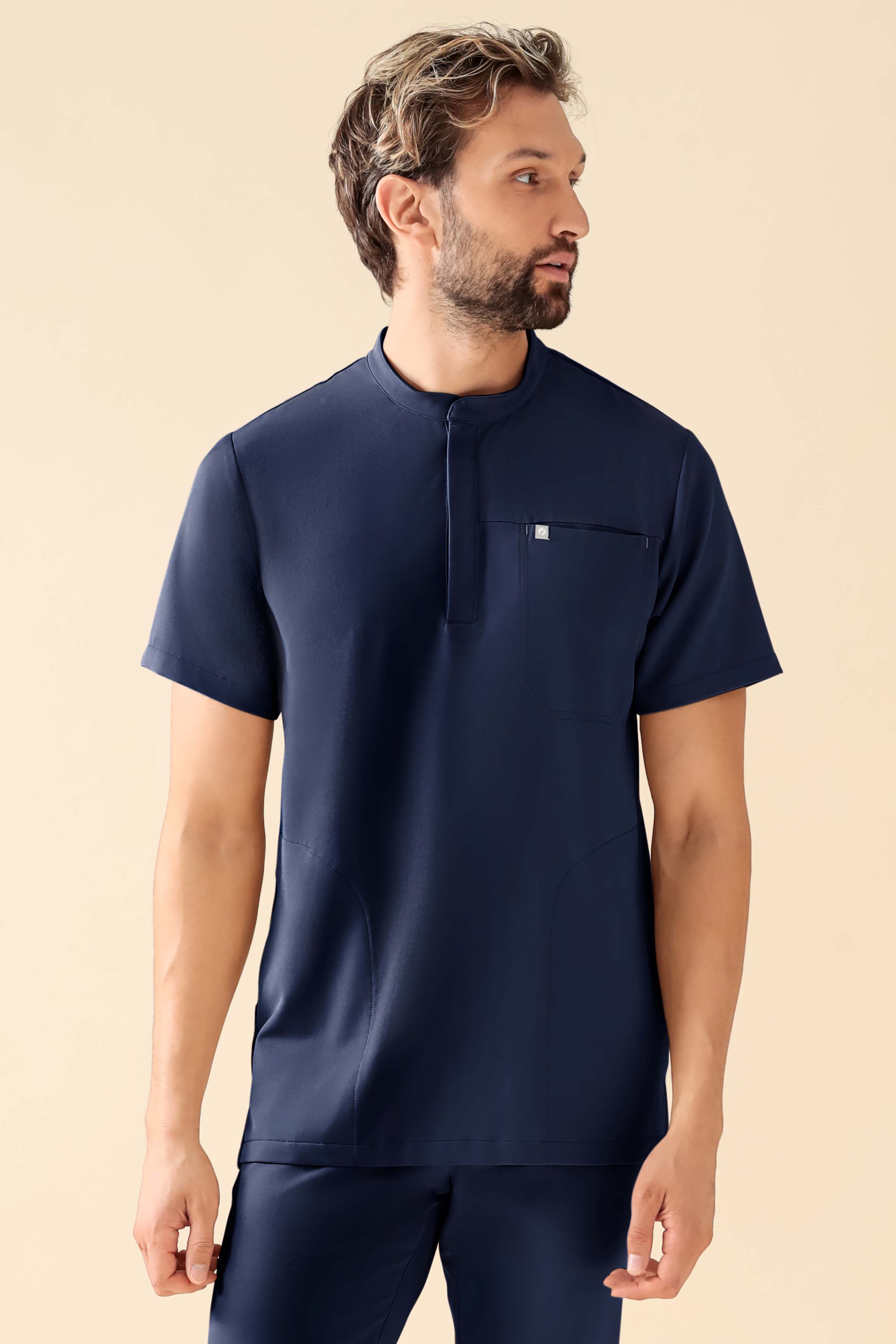 Stilig kittel med knappestolpe og stående krage. Et sporty design som gir maksimal bevegelsesfrihet med vårt eksklusive care-flex materiale, laget av resirkulert polyester og miljøvennlig, trebasert viskose. Stoffet er pustende, hygienisk vaskbart på 60 grader, rynkefritt og klart rett fra vask – perfekt for livet på farten. Med praktiske lommer kan du trygt oppbevare alt du trenger.