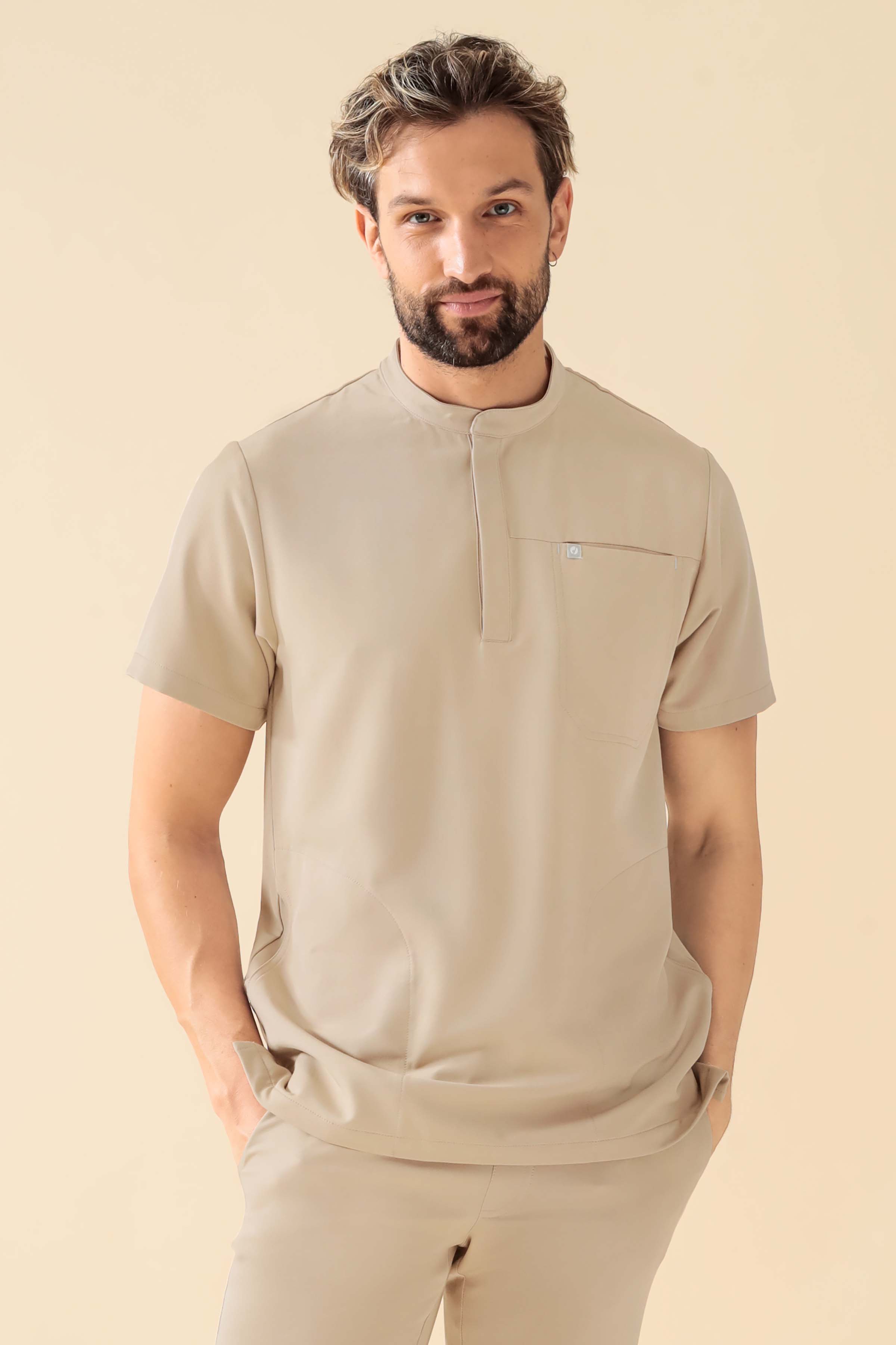 Stilig kittel med knappestolpe og stående krage. Et sporty design som gir maksimal bevegelsesfrihet med vårt eksklusive care-flex materiale, laget av resirkulert polyester og miljøvennlig, trebasert viskose. Stoffet er pustende, hygienisk vaskbart på 60 grader, rynkefritt og klart rett fra vask – perfekt for livet på farten. Med praktiske lommer kan du trygt oppbevare alt du trenger.
