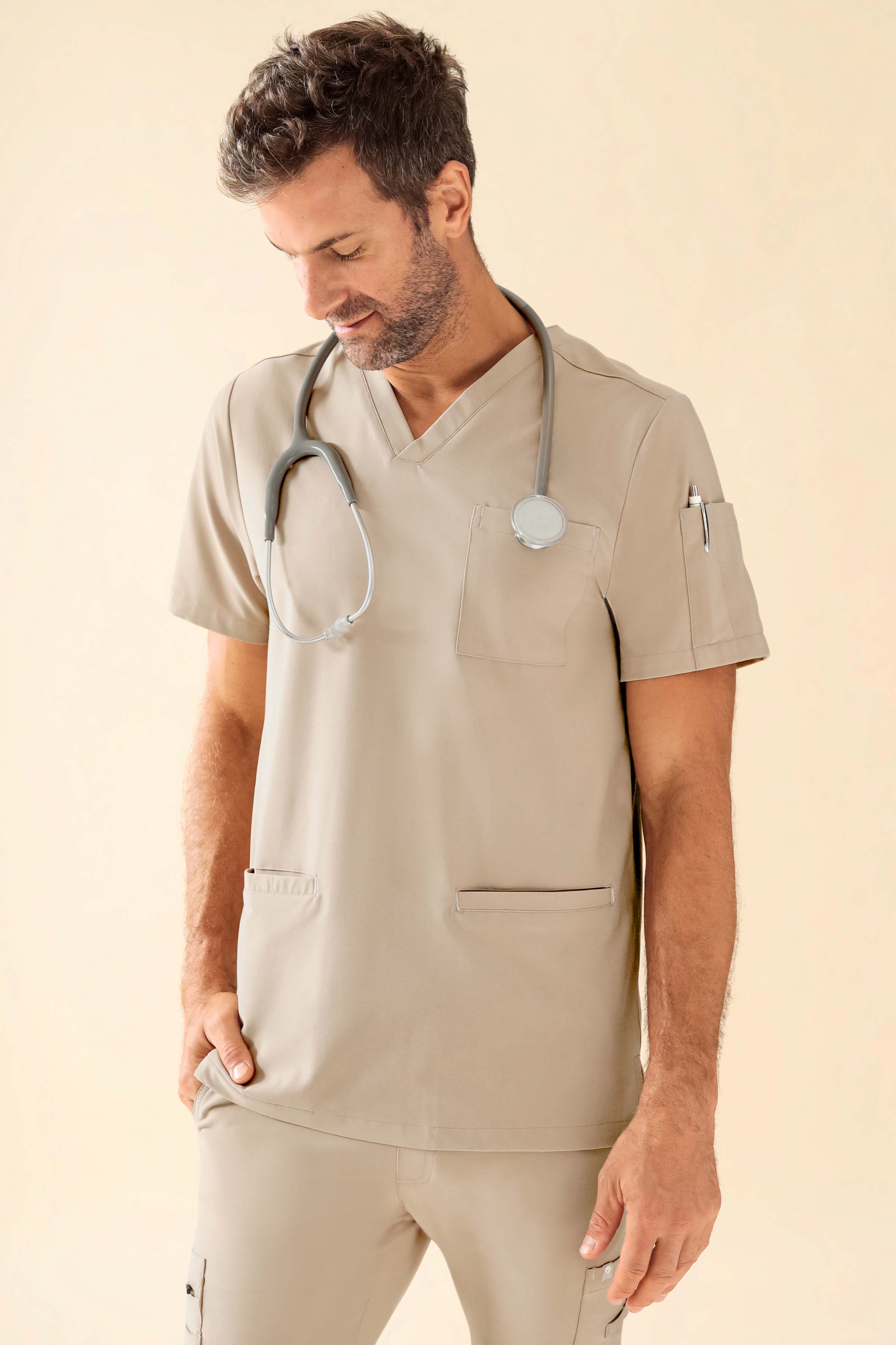 V-hals / 2 sidelommer / 1 innerlomme i høyre lomme / 1 pennelomme venstre erme / 1 brystlomme / Kontrastdetalj på lommer / Splitt i sidene