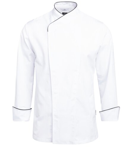 Langermet kokkejakke med skjulte trykknapper i front. Unisex modell. Sømmet luftehull under begge ermer. Pennelomme på venstre erme.