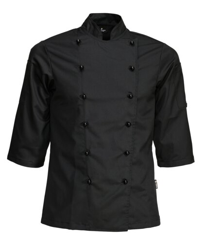 Behagelig kokkejakke med ¾ erme i comfort stretch twill. Hemper for oppbrett av ermer. Lommer på ermene. 12 knapper. Kokkejakken dobbeltspent og klaff kan kneppes mot høyre eller venstre. Lengde midt bak ca 74cm i str 50.
