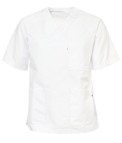 Kittel / Buet kort isydd erme / En brystlomme / To skråstilte sidelommer / Splitt i sidene / V-hals / Kulørte kitler har nøkkelhempe i høyre lomme / Fargekodet størrelsesmerking på brystlomme