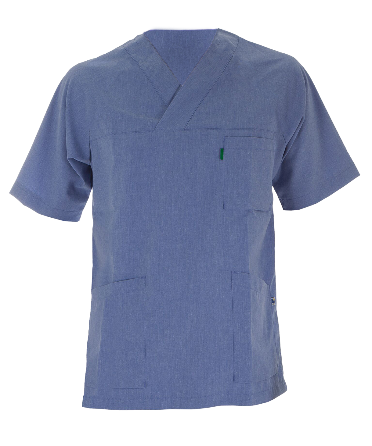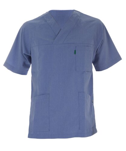 Kittel i flott melert metervare med buet kort raglanerme og en brystlomme. Isydd UHF chip. To skråstilte sidelommer og splitt i sidene. V-hals. Kulørte kitler har nøkkelhempe i høyre lomme. Fargekodet størrelsesmerking på brystlomme.