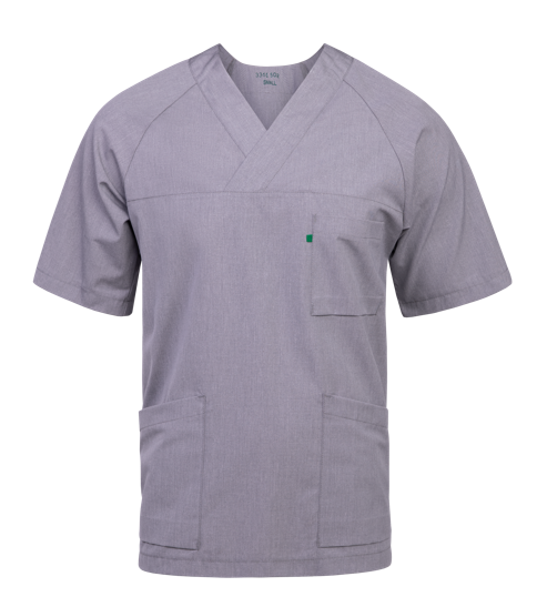 Kittel i flott melert metervare med buet kort raglanerme og en brystlomme. Isydd UHF chip. To skråstilte sidelommer og splitt i sidene. V-hals. Kulørte kitler har nøkkelhempe i høyre lomme. Fargekodet størrelsesmerking på brystlomme.