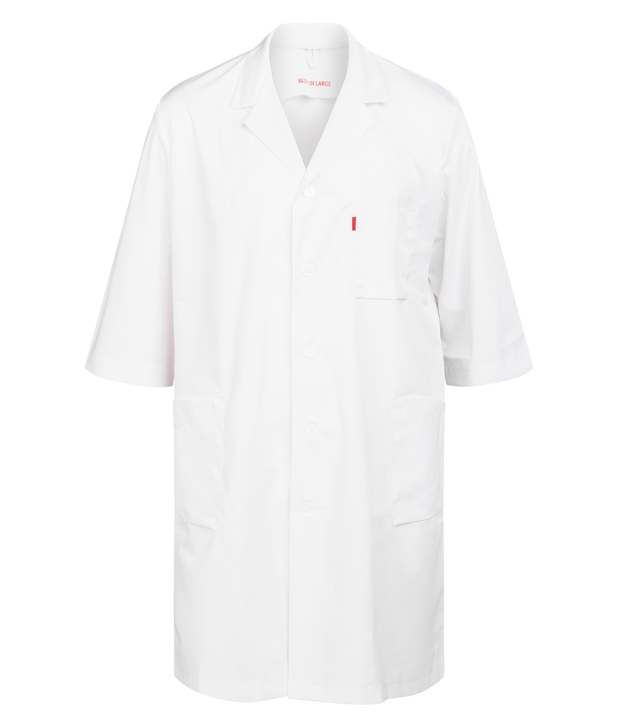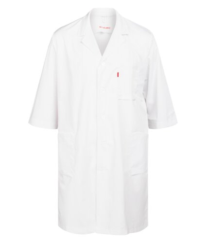 Klassisk legefrakk med ¾-ermer i komfortabel twill-kvalitet. Plastknapper i front. To sidelommer og én brystlomme. Fargekodet størrelsesmerking på brystlommen. Dette plagget har en innsydd UHF chip.