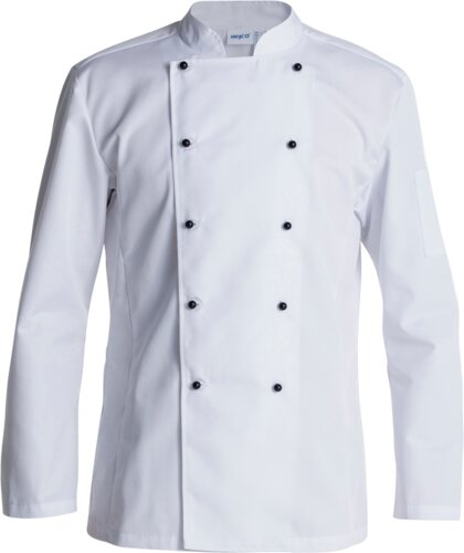 Kokkejakke / Klassisk / Regular fit / Lange ermer / Høy krage / Hengeløkke / Slits ved ermeåpninger / Pennlomme på venstre erme / Avtakbare svarte knapper inkludert