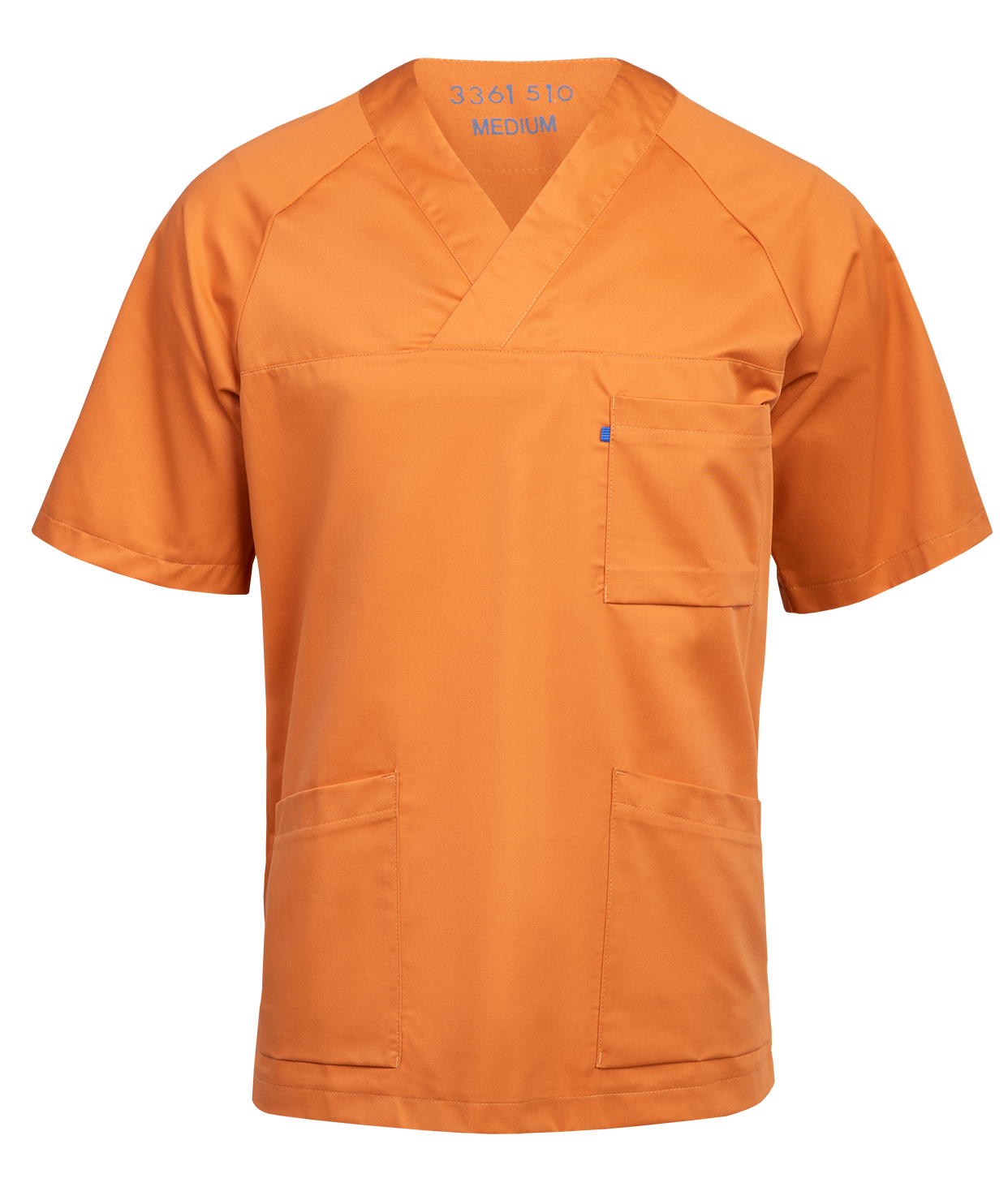 Buet kort raglanerme / Én brystlomme / To skråstilte sidelommer / Splitt i sidene / V-hals / Kulørte kitler har nøkkelhempe i høyre lomme / Fargekodet størrelsesmerking på brystlomme / NS-3361.