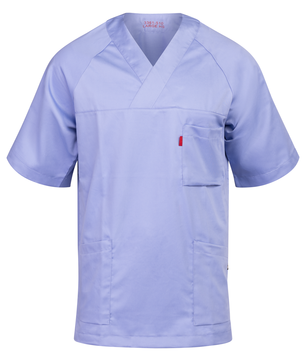 Buet kort raglanerme / Én brystlomme / To skråstilte sidelommer / Splitt i sidene / V-hals / Kulørte kitler har nøkkelhempe i høyre lomme / Fargekodet størrelsesmerking på brystlomme / NS-3361.